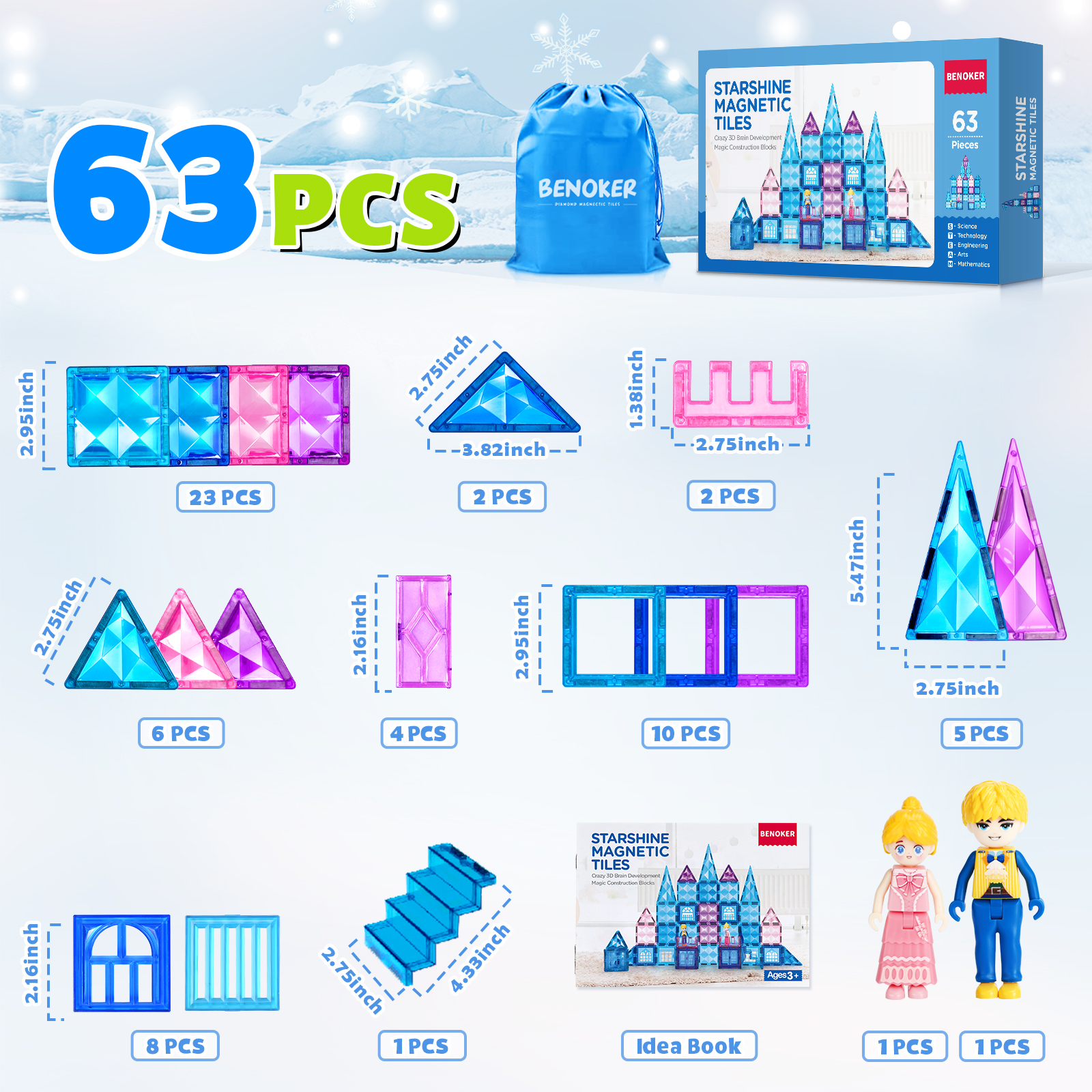 BENOKER 102pcs Frozen Castle Magnetic Tiles - 3D Diamond Building Blocks, STEM Educational Kids Toys for Pretend Play, 3 4 5 6 7 8 Year Old Girl Birthday Gifts for Your Princess and Prince