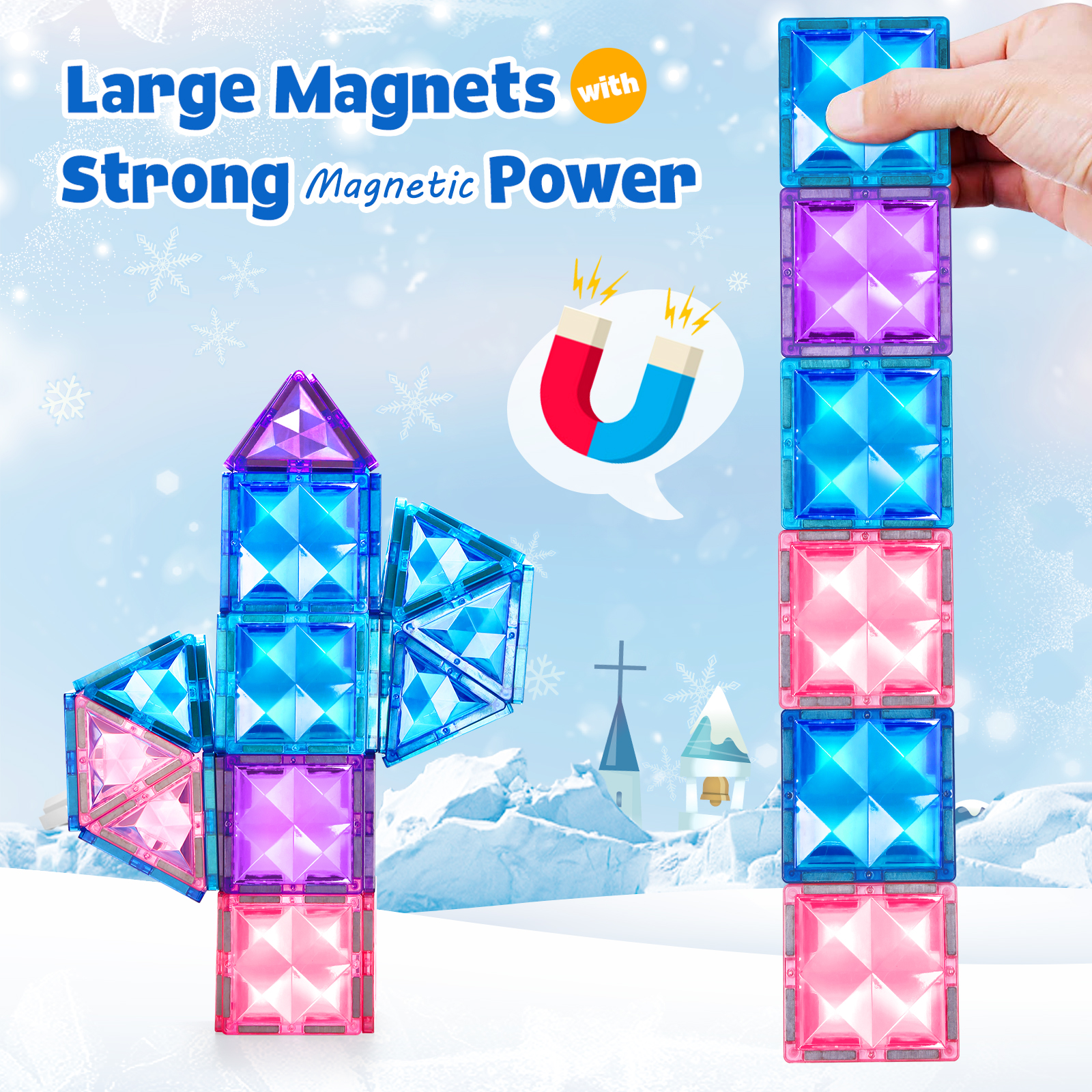 - Pretend Frozen Castle Characters-The Frozen World magnetic tile set is perfect for children to play with and build frozen castles. They can let their creativity and imagination run wild with the help of our magnetic block toys!