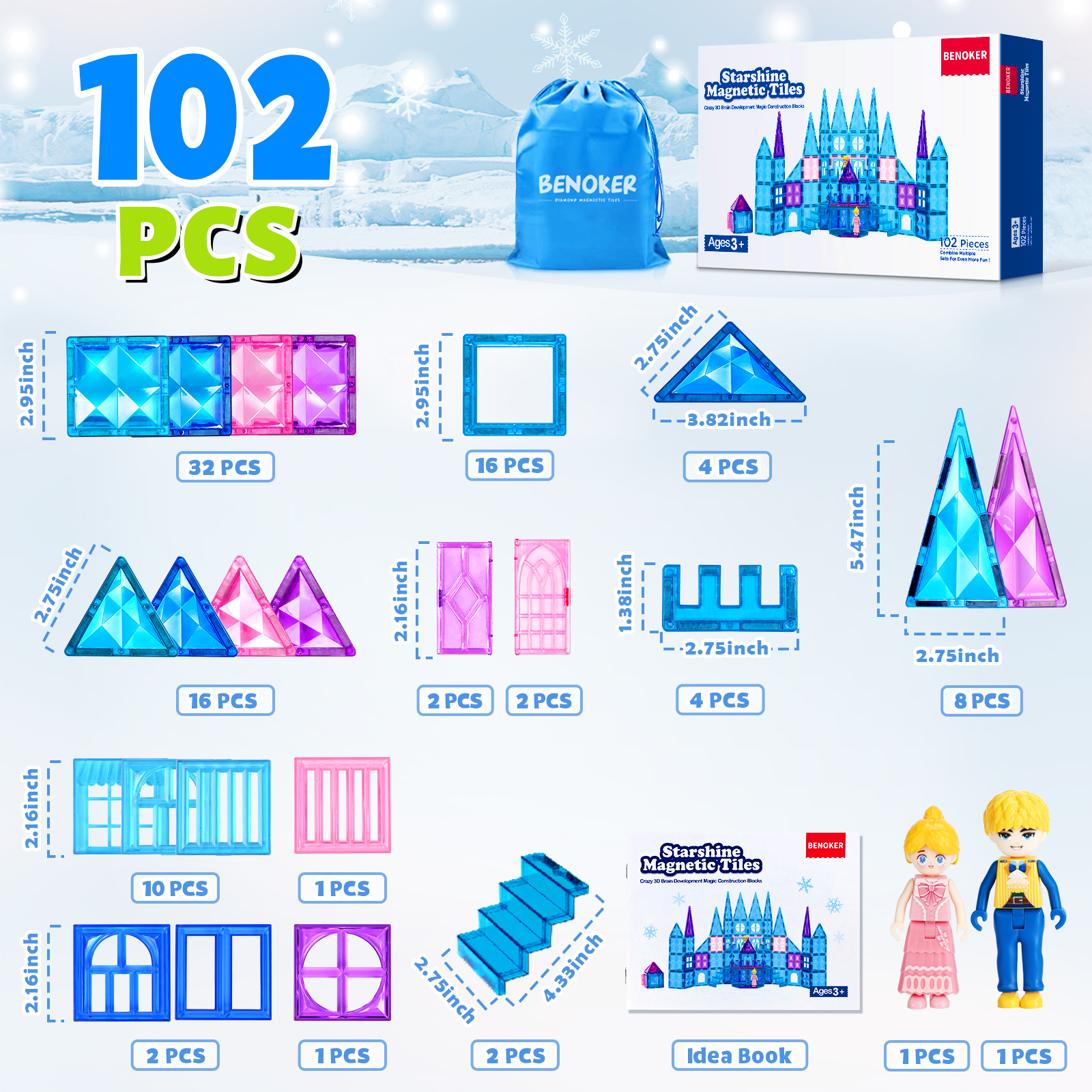 BENOKER 102pcs Frozen Castle Magnetic Tiles - 3D Diamond Building Blocks, STEM Educational Kids Toys for Pretend Play, 3 4 5 6 7 8 Year Old Girl Birthday Gifts for Your Princess and Prince