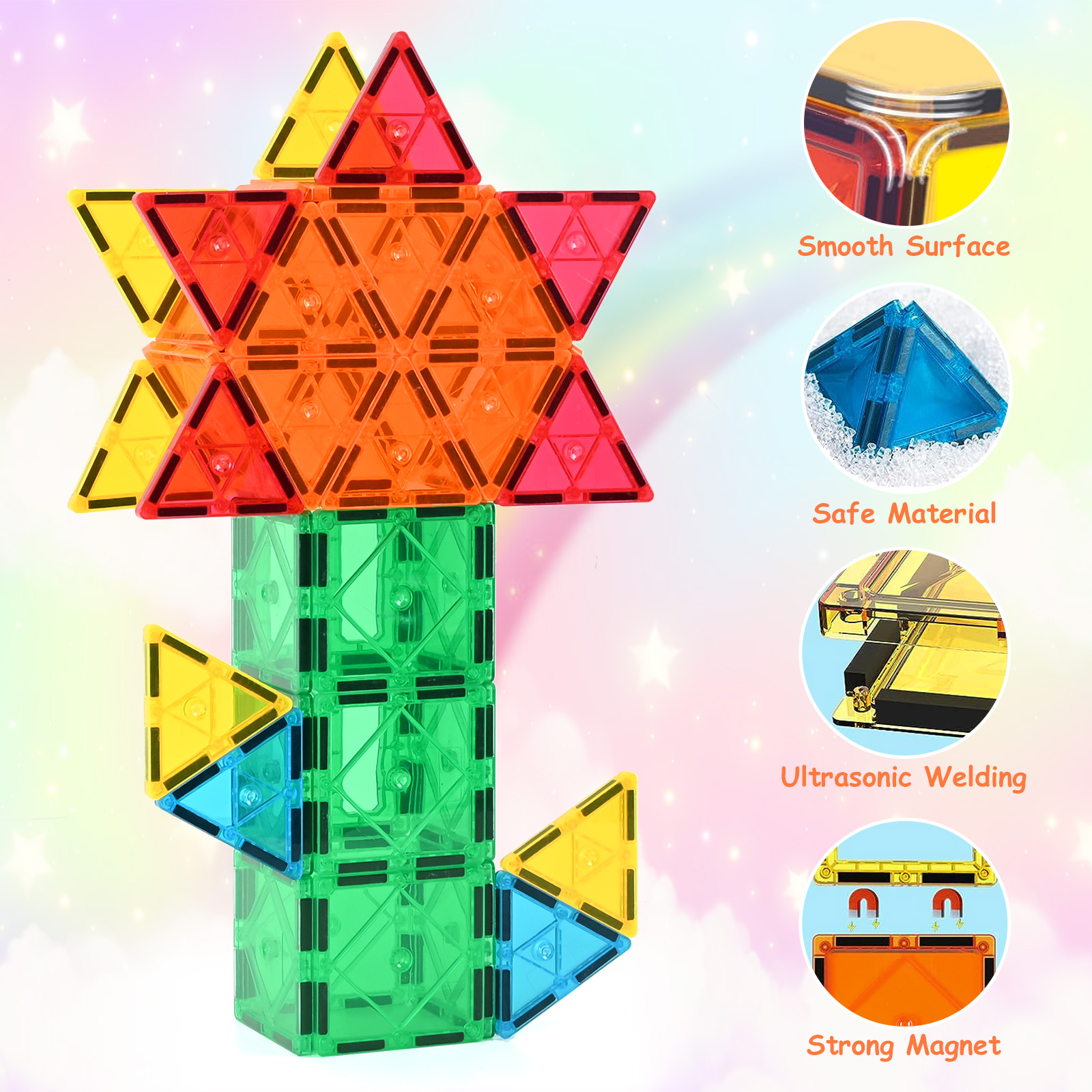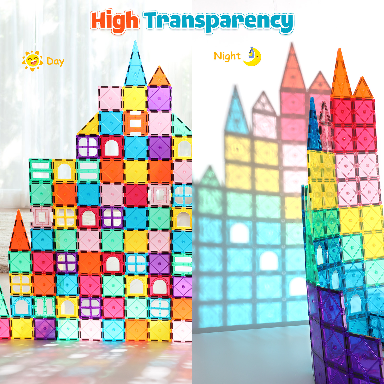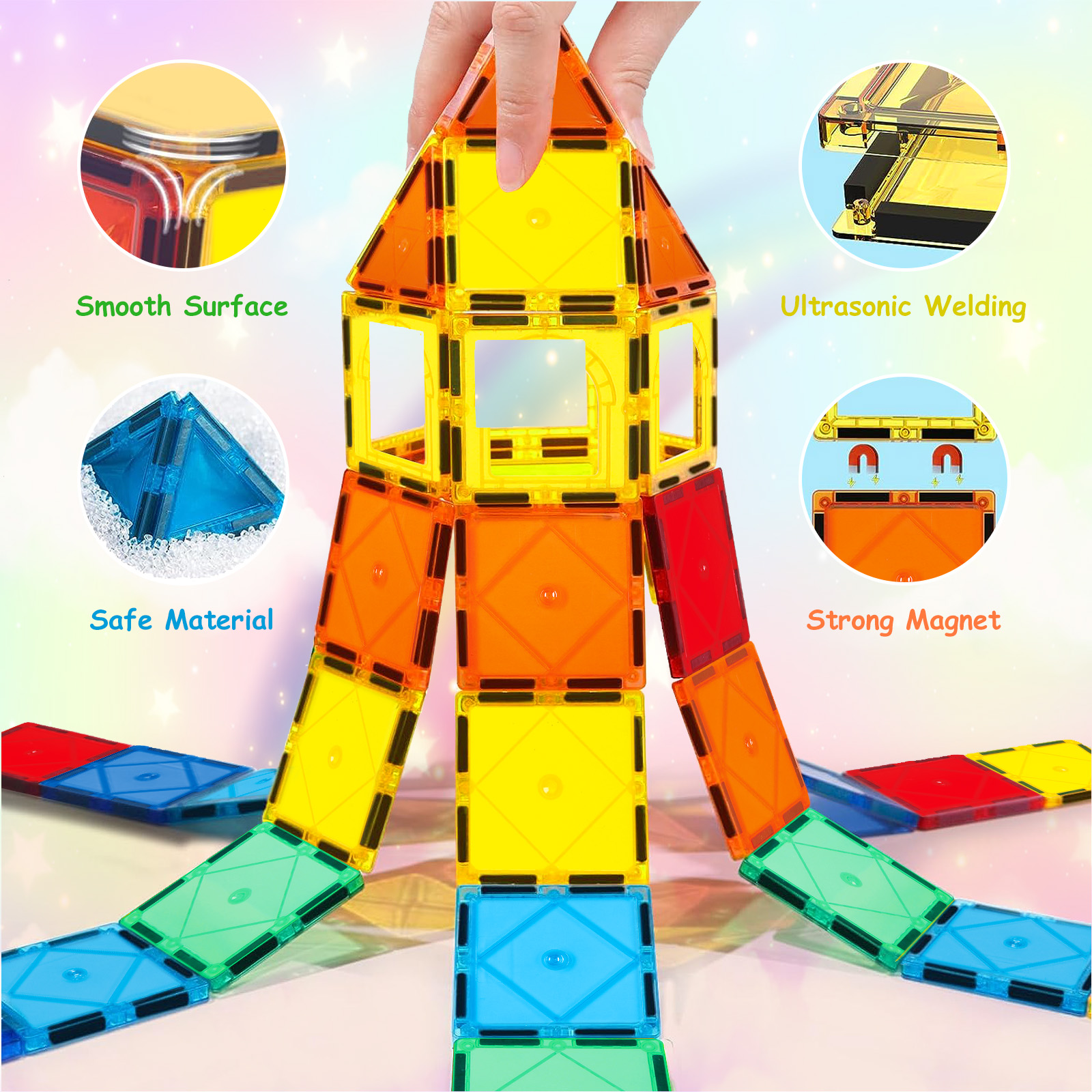 - 1.RAINBOW TILES: Magnetic tiles are colorful like a rainbow. The edges are rounded and the surface is smooth like ice. These tiles are brightly colored, translucent in the light, fascinating and can capture the curiosity of children.
