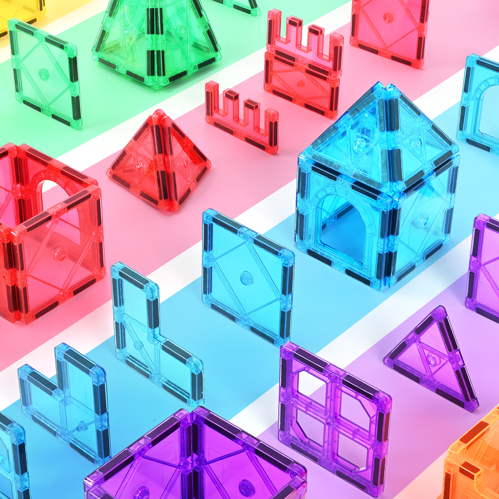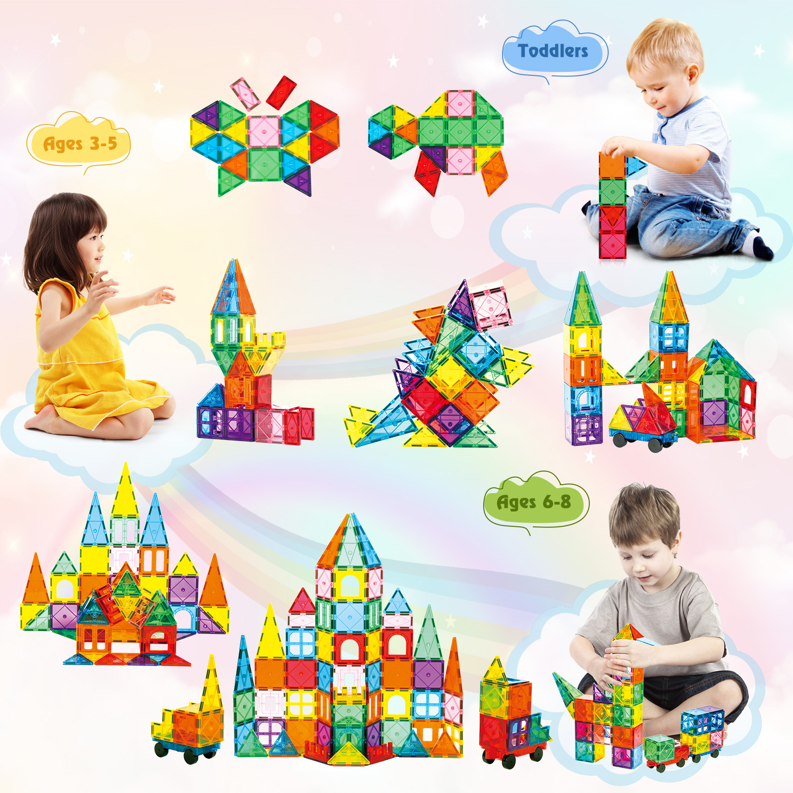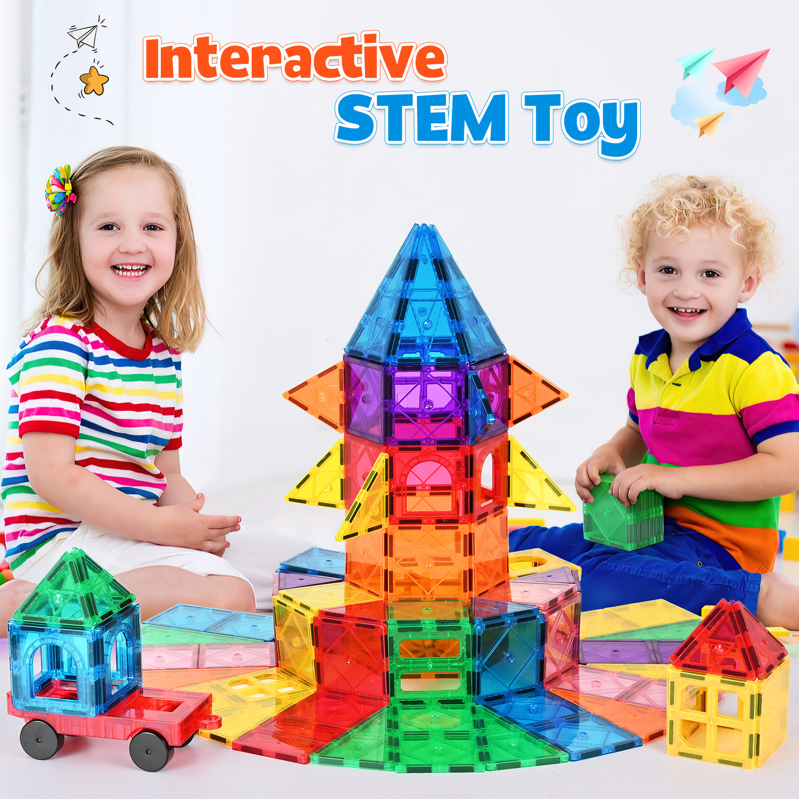 - 2.LEARNING THROUGH PLAY: Through colorful tiles, children's creativity can be stimulated, and they can create unique and visually appealing two- or three-dimensional structures to develop STEM-related skills.
