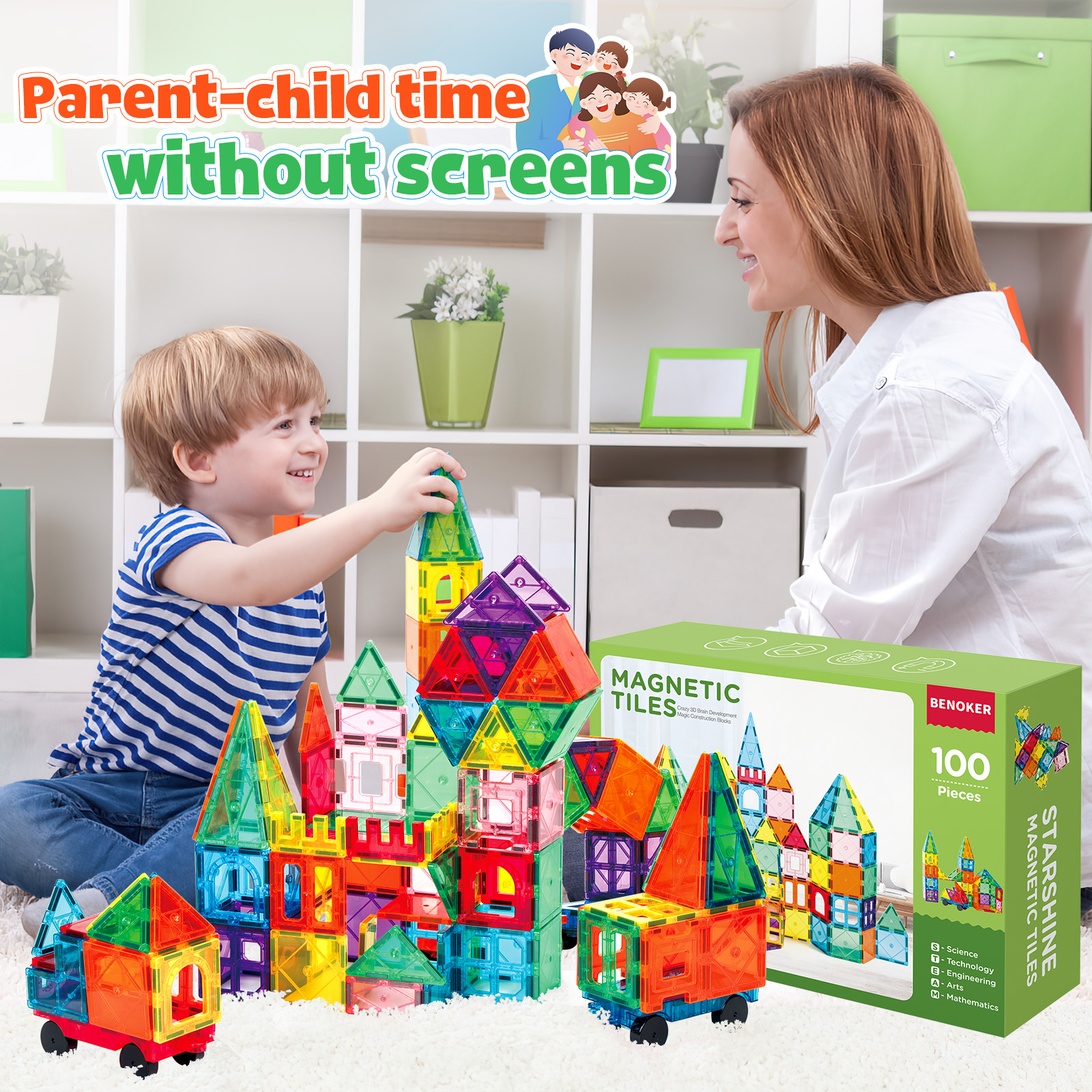 100 PCS Magnetic Tiles Building Blocks, STEM Montessori Toys Building Sets Gifts for Boys and Girls with 2 cars compatible with Other Magnetic 3D Building Blocks